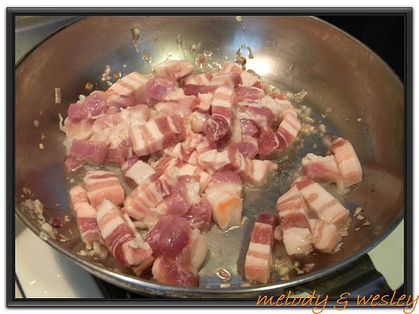 3.接著剛剛的原鍋,直接下三層肉炒熟。
