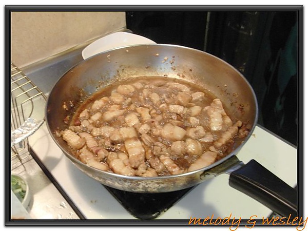 4.炒熟後下調好的醬汁(醬油、米酒、冰糖),拌炒。