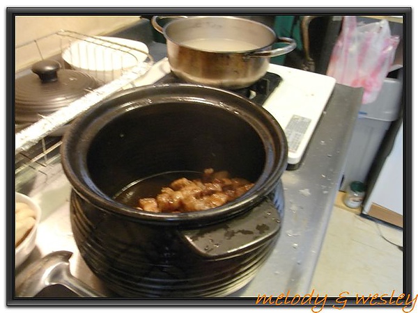 5.把炒好香噴噴的肉換到砂鍋,然後加入1000cc的高湯。